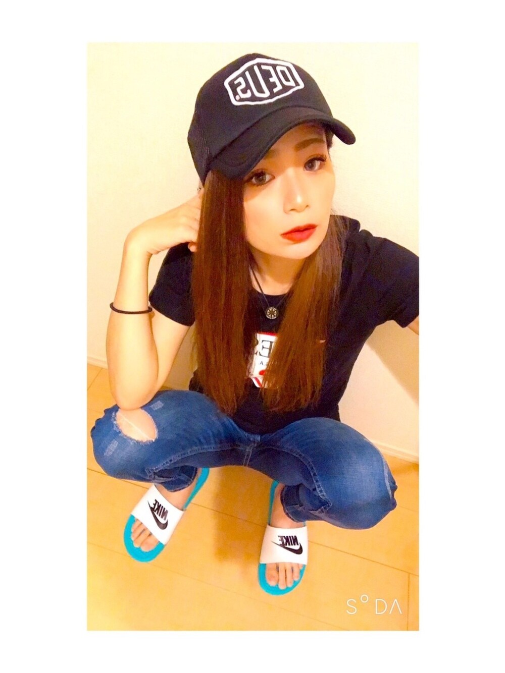 Hello⸜︎❤︎︎⸝ 今日は幼なじみと女子会𓀀🍀 久しぶりに会ったので弾丸talk してきました◡̈⃝︎⋆︎* 本日のcode👗☆ * cap ☞ DEUS * tops ☞ GUESS * necklace ☞ BANDEL * pants ☞ GRL *sandal ☞ NIKE