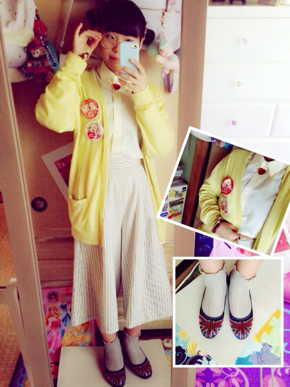 パンクブーブー黒瀬さんポーズになりましたwww。 ガウチョパンツとお下がりカーデでダボ感出しました。パンプスできっちり。 シャツも黄色で合わせているんですが見にくいですね😎