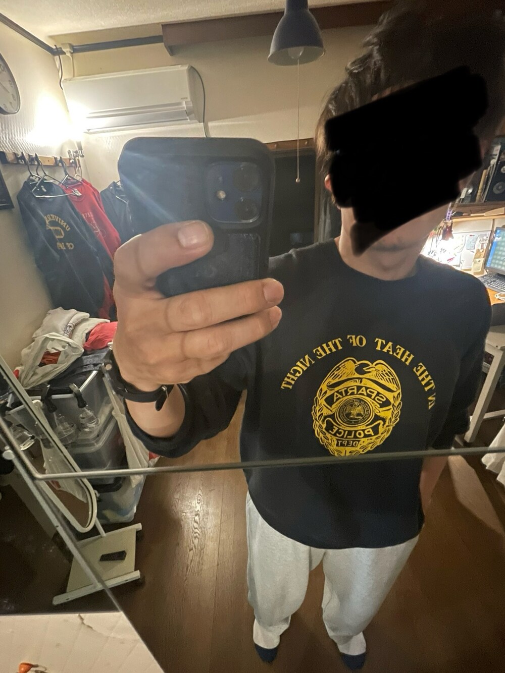 古着のスウェットにグレーのユニクロCスウェットパンツです。シンプルだけどこんな格好が好きです。