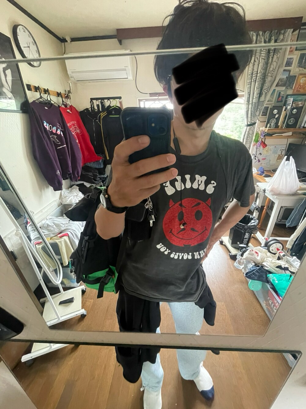 スマイリーマークが気にってる古着のTシャツに格安通販サイトTemuのスウェットパンツを穿いてチャムスのリュックにGUの ZIPアップパーカーを腰に巻いてそれっぽいポーズをキメテいる様子です。