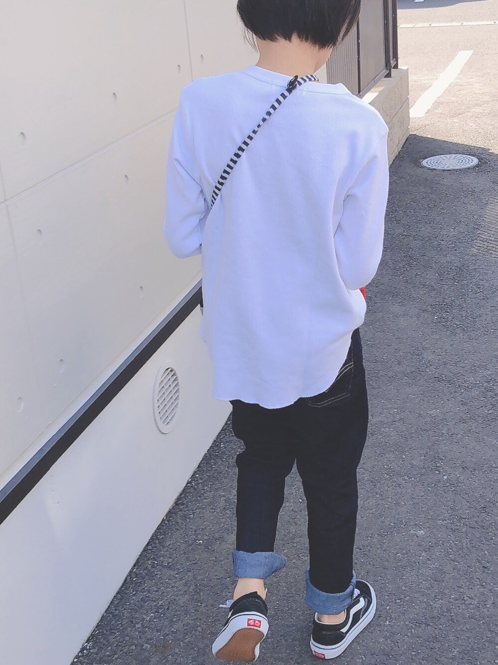ホワイト系のトップス、ブルー系のデニムパンツを着用したキッズの冬コーディネートの1枚目の写真