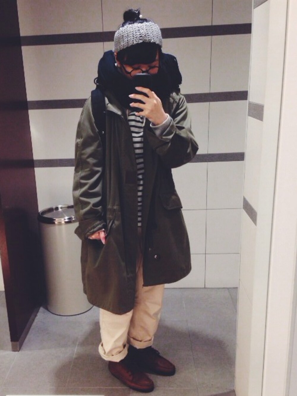 グリーン系のモッズコートを着用したレディースの冬コーディネートの1枚目の写真