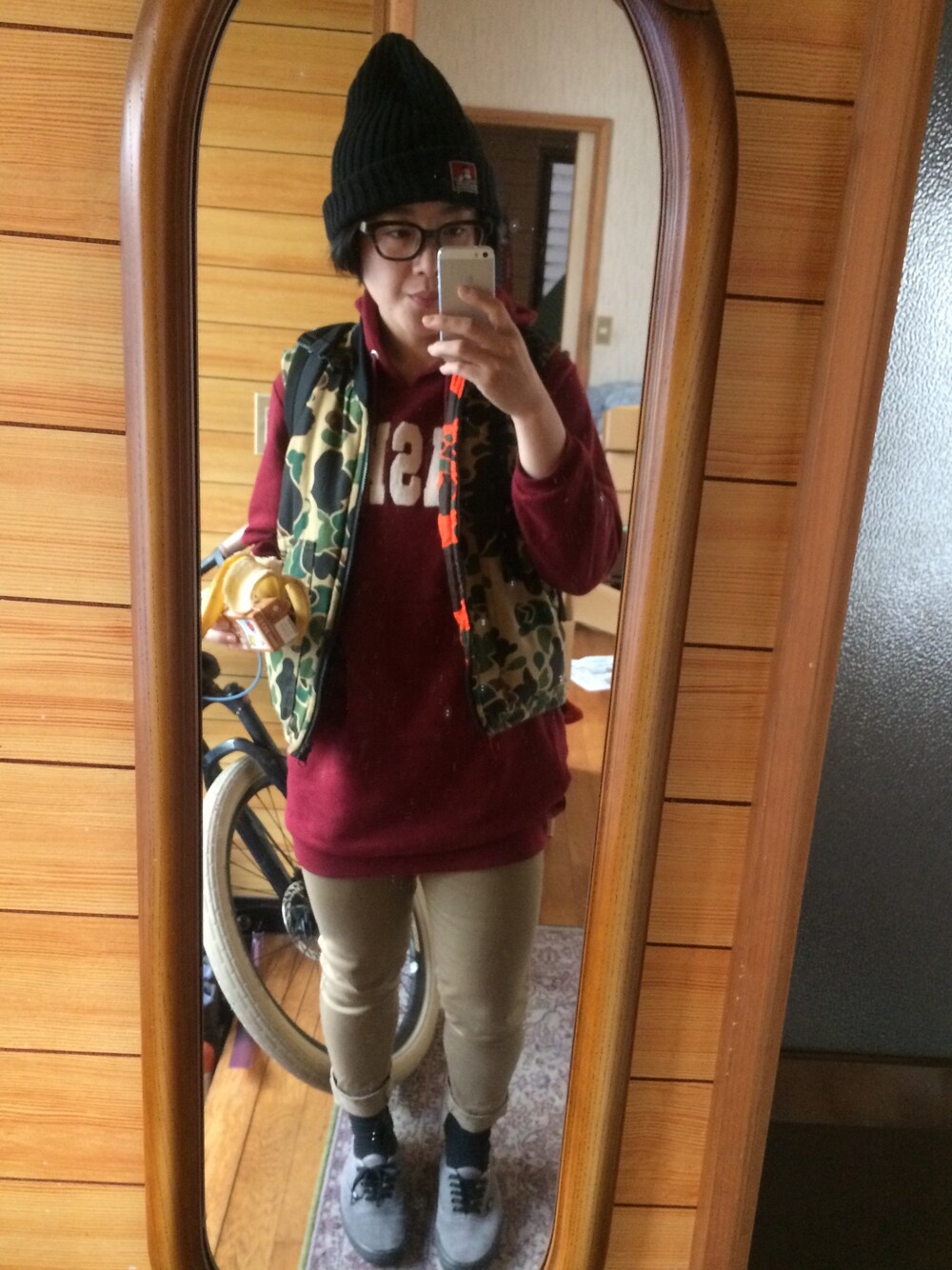 あら、なんかニット帽の先、伸びすぎじゃない? ズボンとトレーナーしまむら。 ダウンベストは両国の古着屋でーす。