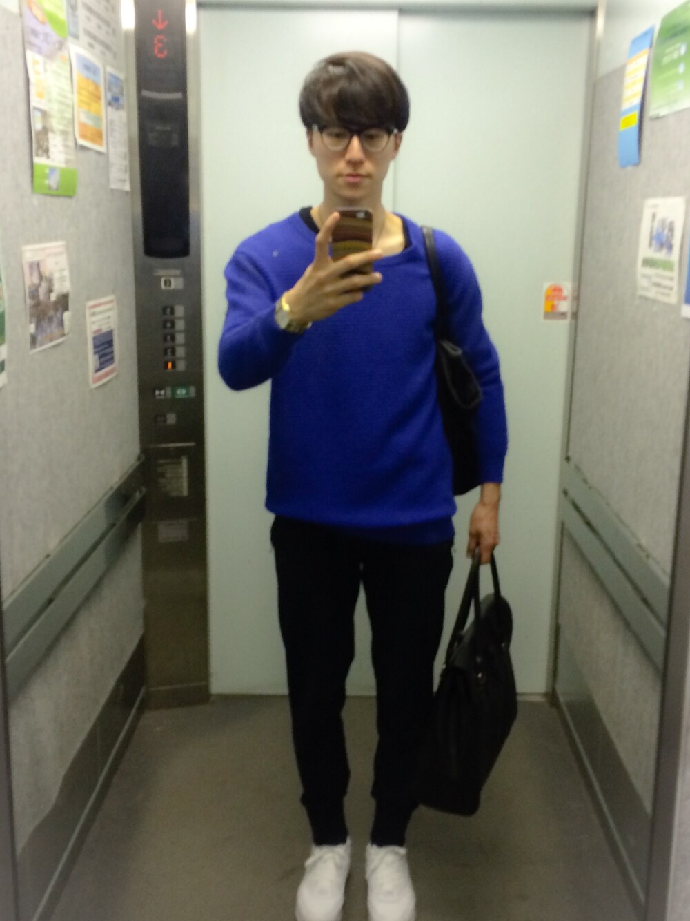 ちょっと脚が短く見えてしまいますが… スウェットとLuisのブルーニットで、休日リラックススタイル。