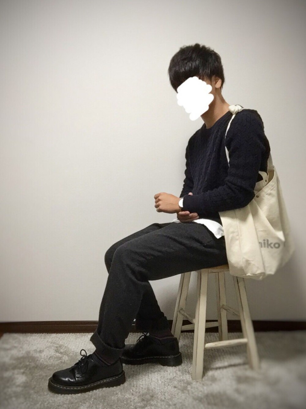 秋感強い紺色セーター に アクセントとして 白のレイヤード ボーダーの靴下 で合わせました💫💫 ズボンはスーツの様な 落ち着いた生地感をチョイスして 低身長でも大人っぽいスタイルにしました😎✨