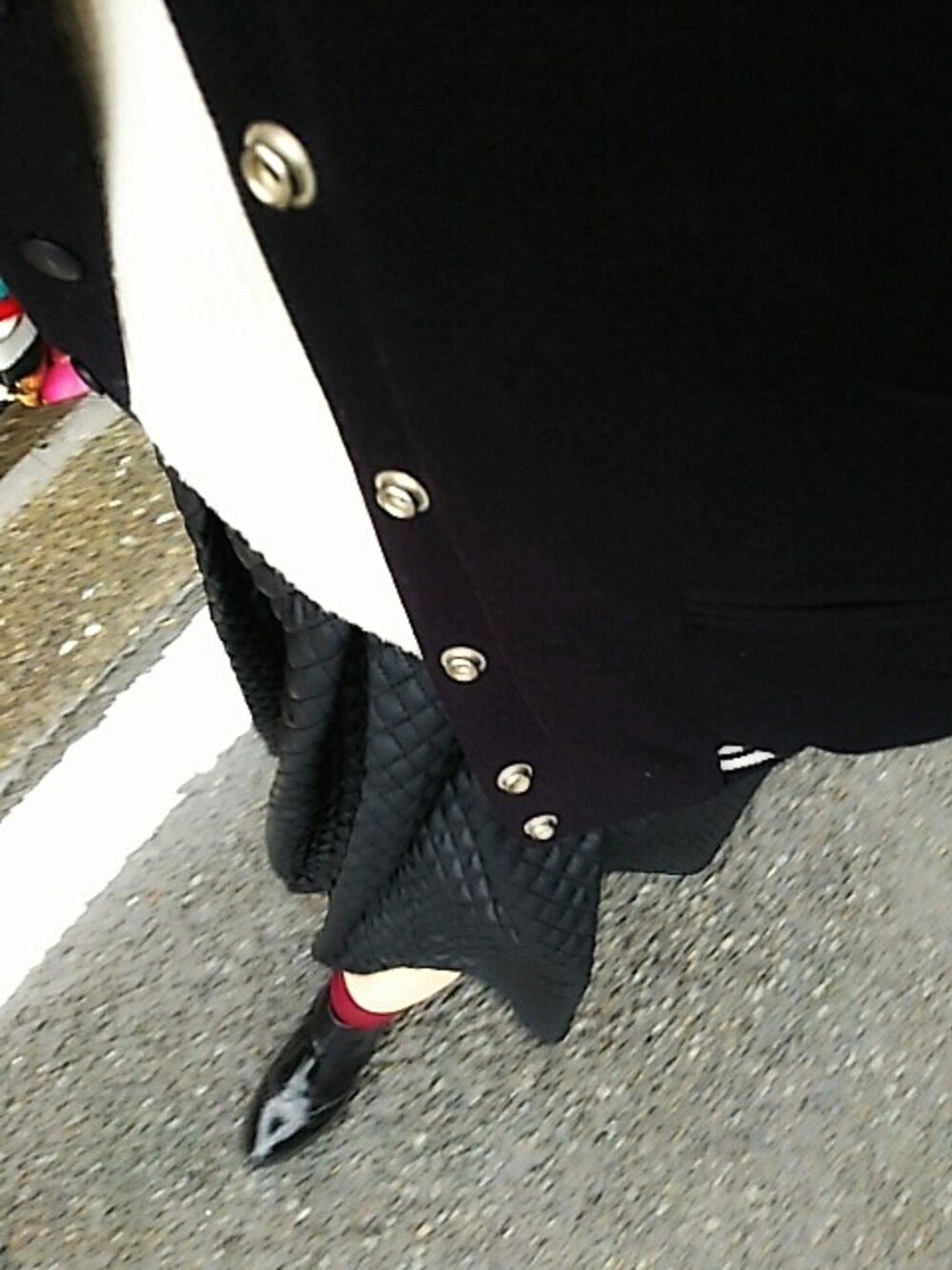 フェイクレザーのキルティングスカートにソックスでシンプルに 冷え性なワタシには素足にソックス、寒すぎました ソックスのバーガンディーを差し色 と思っていたけど、ニットと帽子の白の勝利となりました 雨なのでバッグは急遽gabsさんに
