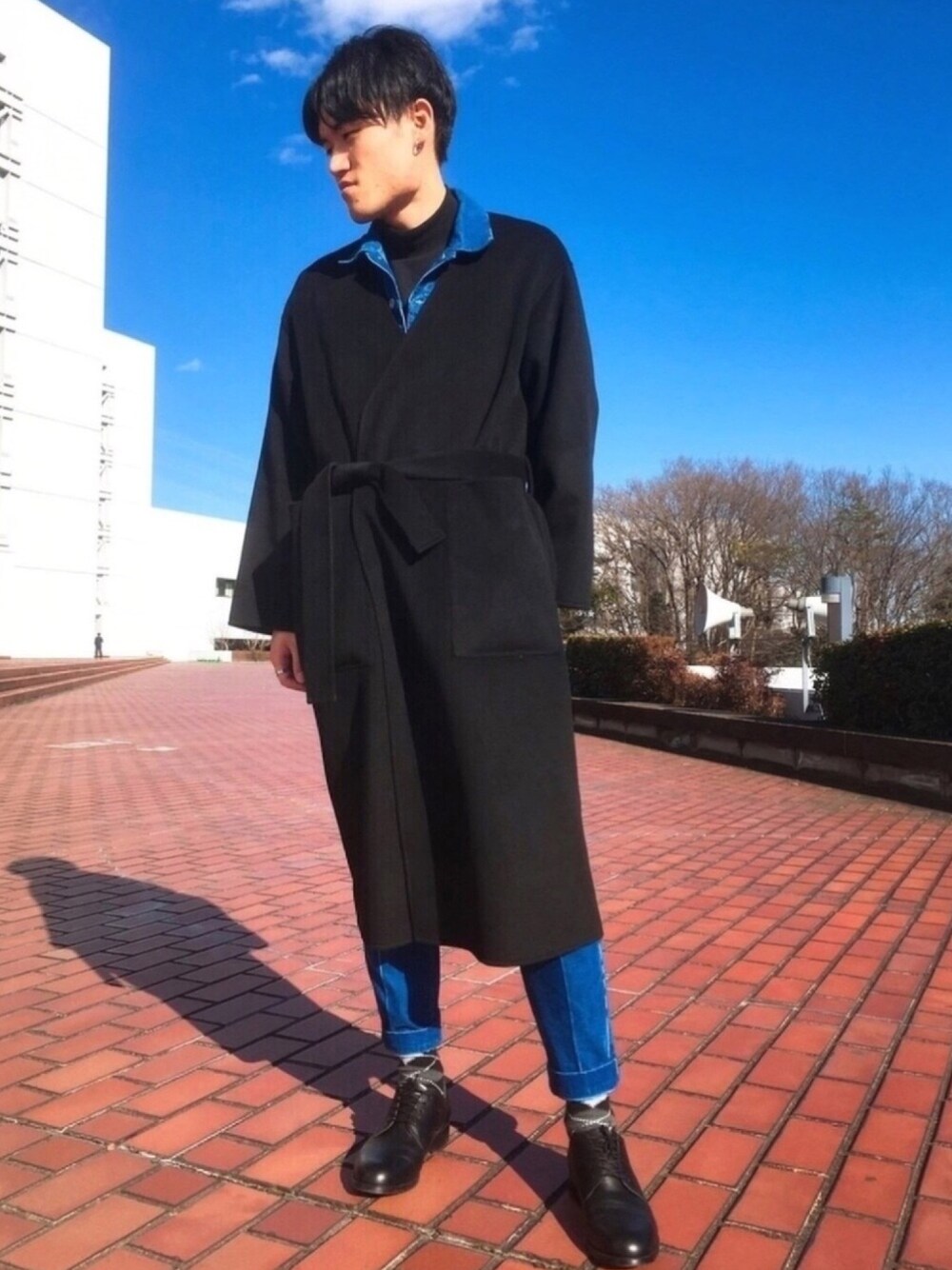 セットアップの上からガウンコートを羽織ってます。 koeの黒のタートルTシャツを着てます。 セットアップに合わせるのにピッタリ。 このノーカラーコートは黒とカーキのリバーシブルで幅広く使えます。 ワンポイントにアーガイルのソックスを インディゴ染めのコーデュロイセットアップはなかなかないのではないでしょうか。 セットアップの写真も是非見てみてください。