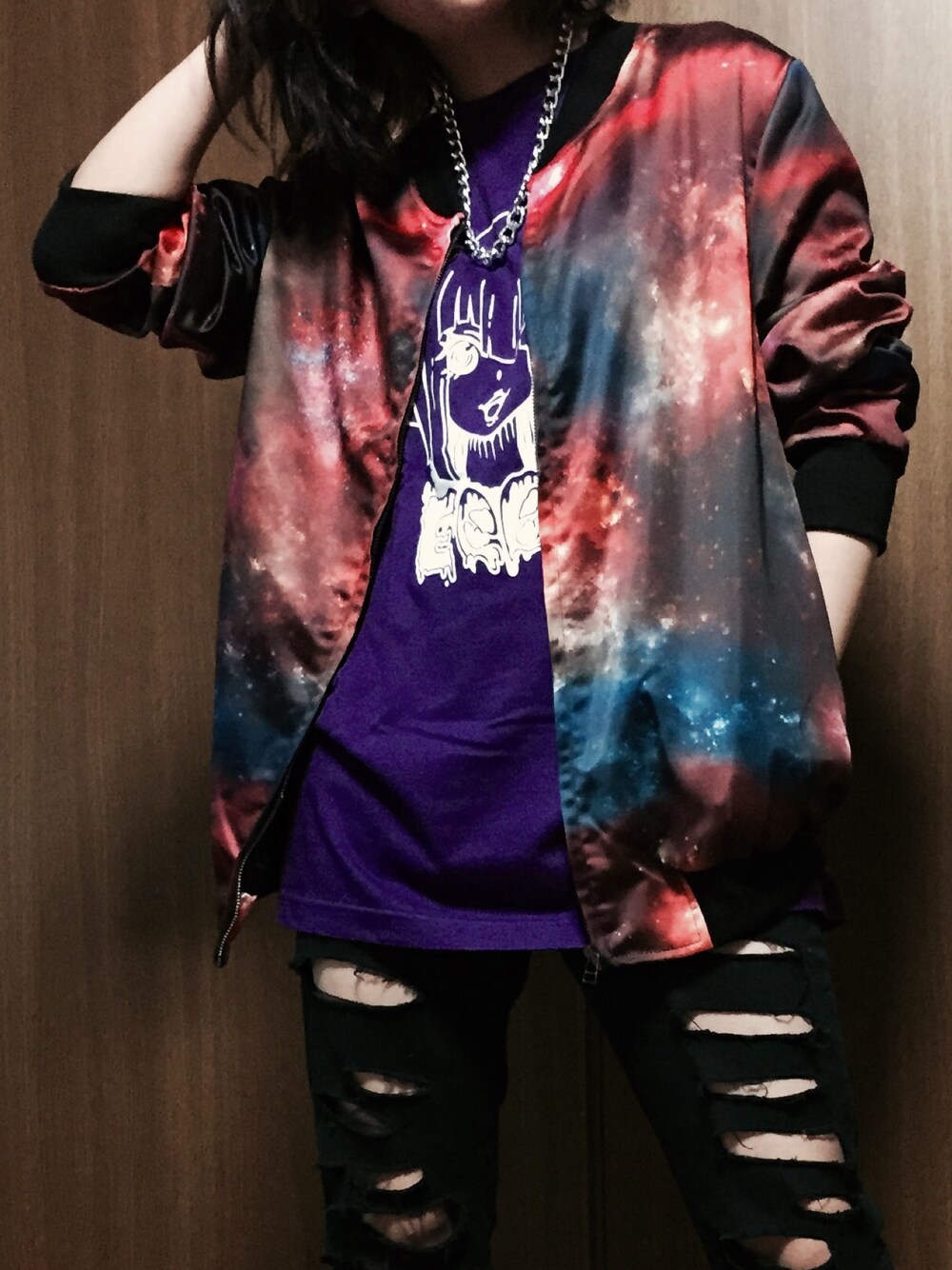 中に着てるTシャツは私のブランドの「生首Tシャツ」です!