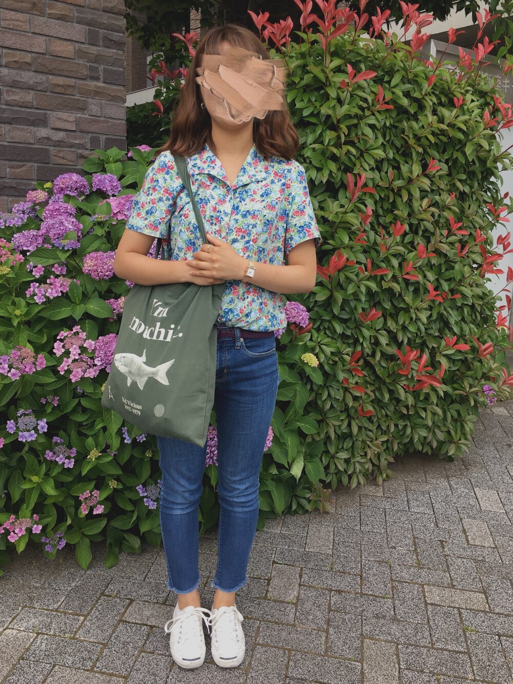 開襟シャツ涼しいし 形も可愛いですよね〜〜 あとこのお魚トートは2年前に韓国のAlandで¥1000でゲットしたものです! お気に入りです🐟🐟🐟