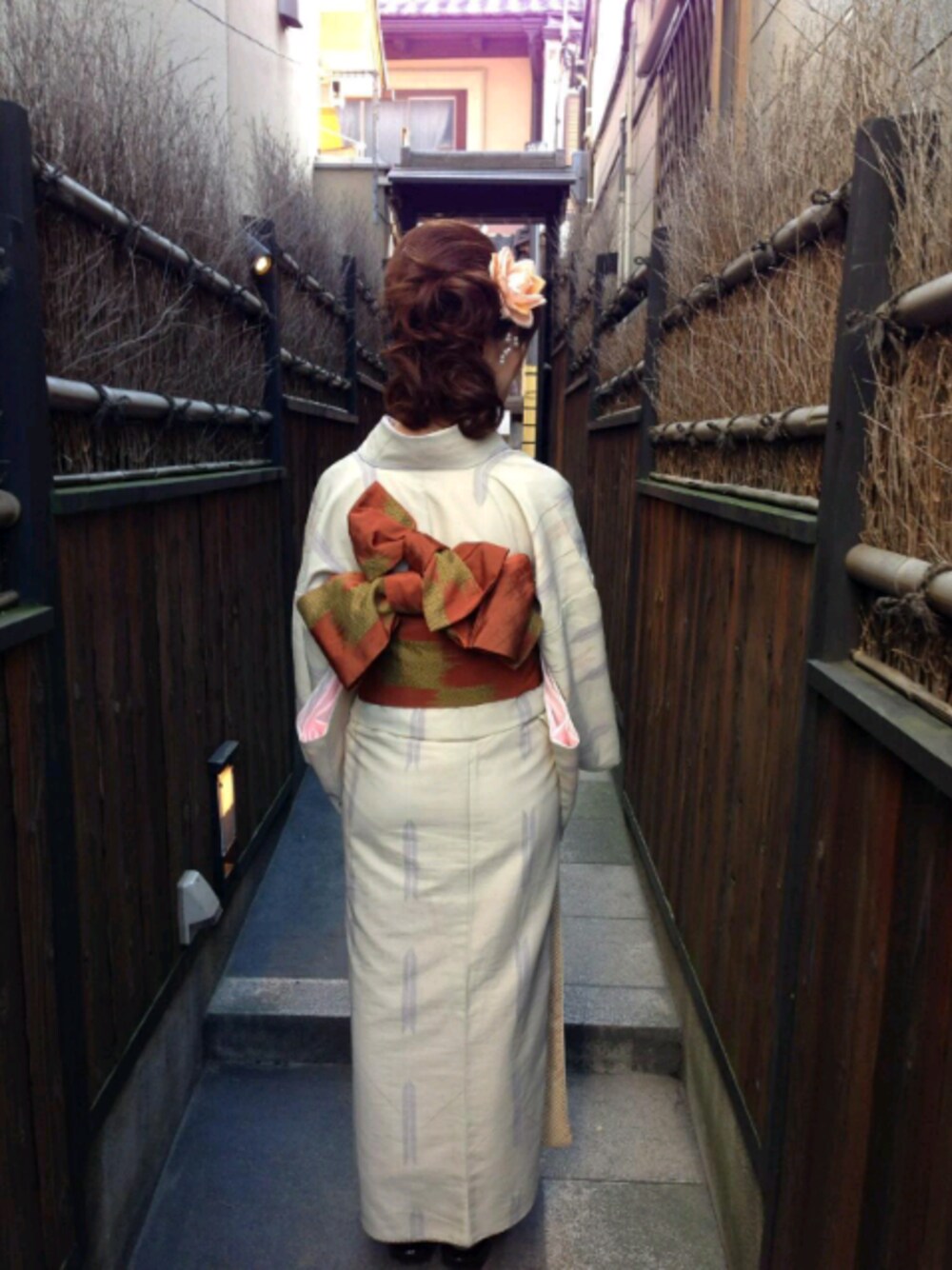 京都にて。 オフホワイトの生地に薄い紫とオレンジの柄が入ってます。 オレンジ色の帯はちょうちょ型に結ってもらいました。