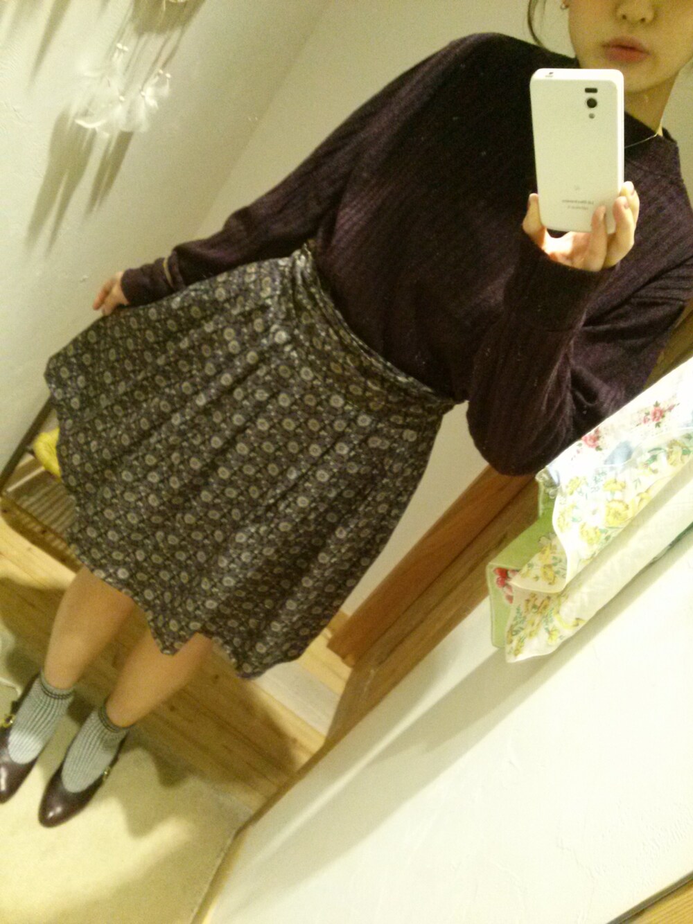 ボルドーの首つまりトップス 古着のスカート、パンプス 靴下は3コインズ 髪はアップです。