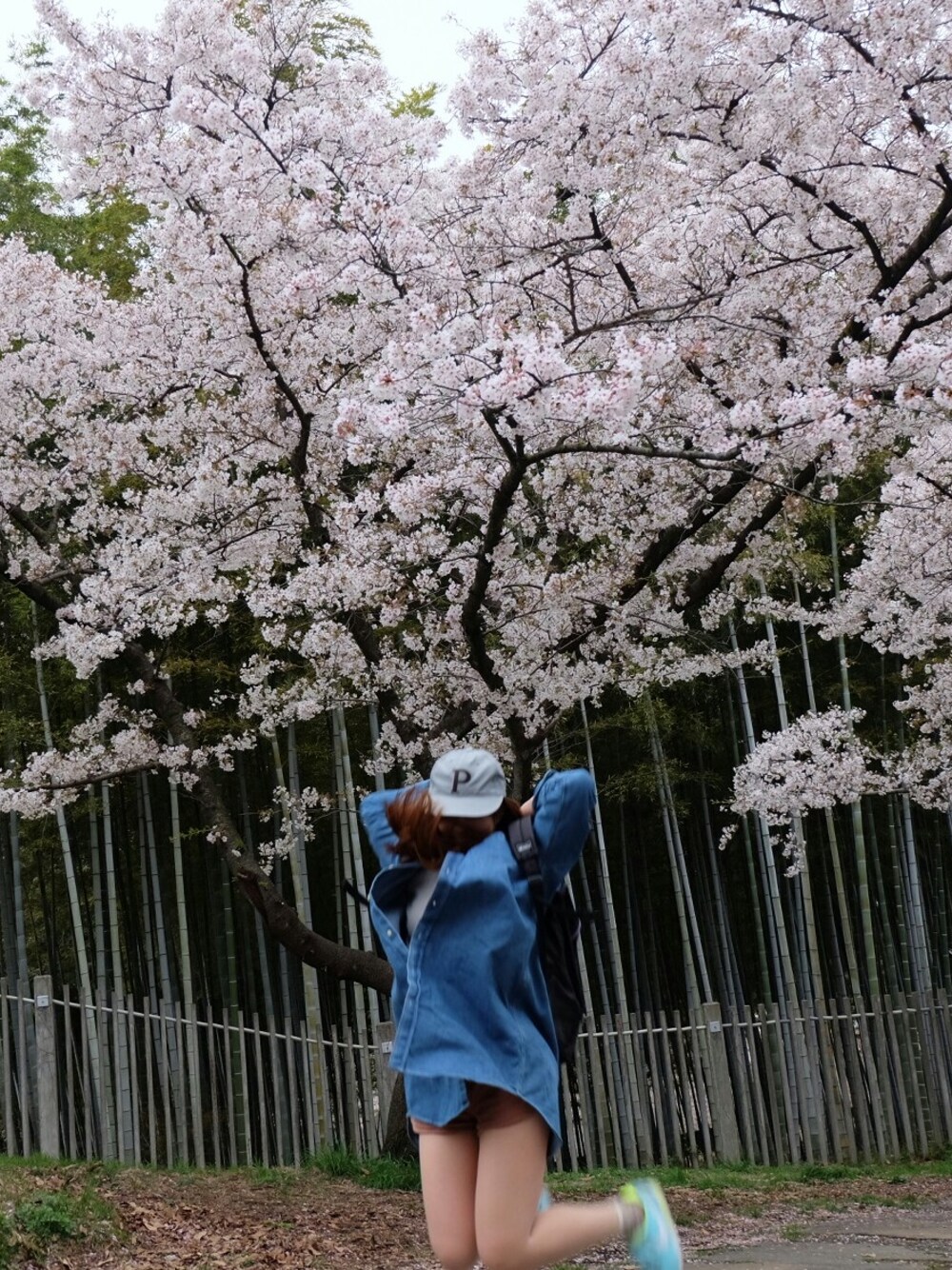服部緑地をお散歩!桜綺麗でした~! UNIQLOのキャップ 中はライトグレーのタートルネックにコーデュロイの短パン