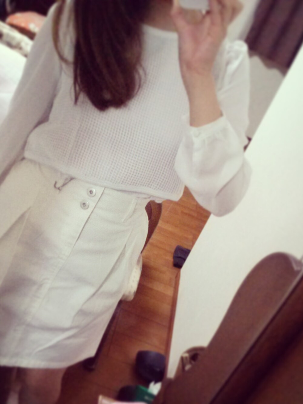 上下ミスティックのホワイトコーデ。 トップスはネットになってて可愛い 部屋汚い。