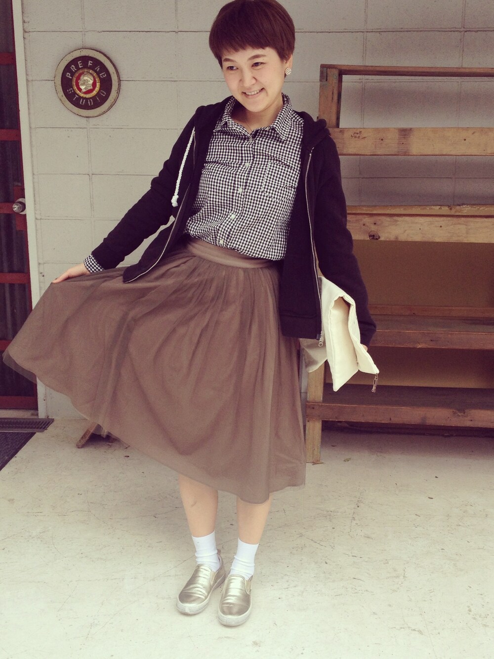 チェックシャツとチュールスカート