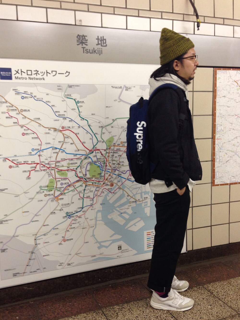 初シュプ初築地駅 アウター:リー パーカー:コズミックワンダー パンツ:ディッキーズ スニーカー:アイジュンヤワタナベ リュック:シュプリーム