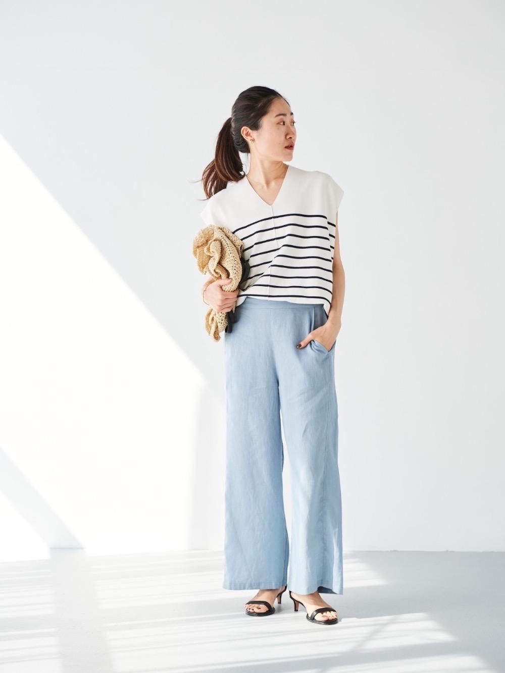 30代前半/159cm/骨格ナチュラル/普段サイズS-M/着用サイズ38/instagram:otm_____98 【ガーターアミコクーンシルエットニット】 サイズ感:程良いゆとり、ヒップにかかる丈 素材感:ドライタッチ、生地が薄すぎない 着用感:Vネックが深すぎず着やすい。コンパクトで何にでも合う。 【麻ワイドクロップドパンツ】 サイズ感:ウエスト、丈感ちょうど良い(長めが好みの方は少し短く感じそう) 素材感:薄手でごわつきなし、柔らかい 着用感:真夏も涼しく穿ける軽やかさ。