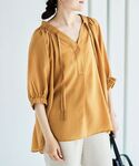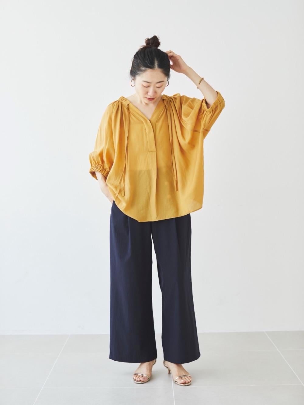 30代前半/159cm/骨格ナチュラル/普段サイズS-M/着用サイズ38/instagram:otm_____98 【シアーVネックギャザーブラウス】 サイズ感:身幅ゆったりめ、ヒップが隠れる丈 素材感:柔らかい、透け感あり 着用感:さらっと軽い。ゆるっとしていて楽ちん。 【ナイロンストレッチマリンワイドパンツ】 サイズ感:程良いゆとり、踵に少しかかる丈 素材感:冷感あり、伸びる、やや薄手 着用感:ストレッチが効いていて動きやすい◎