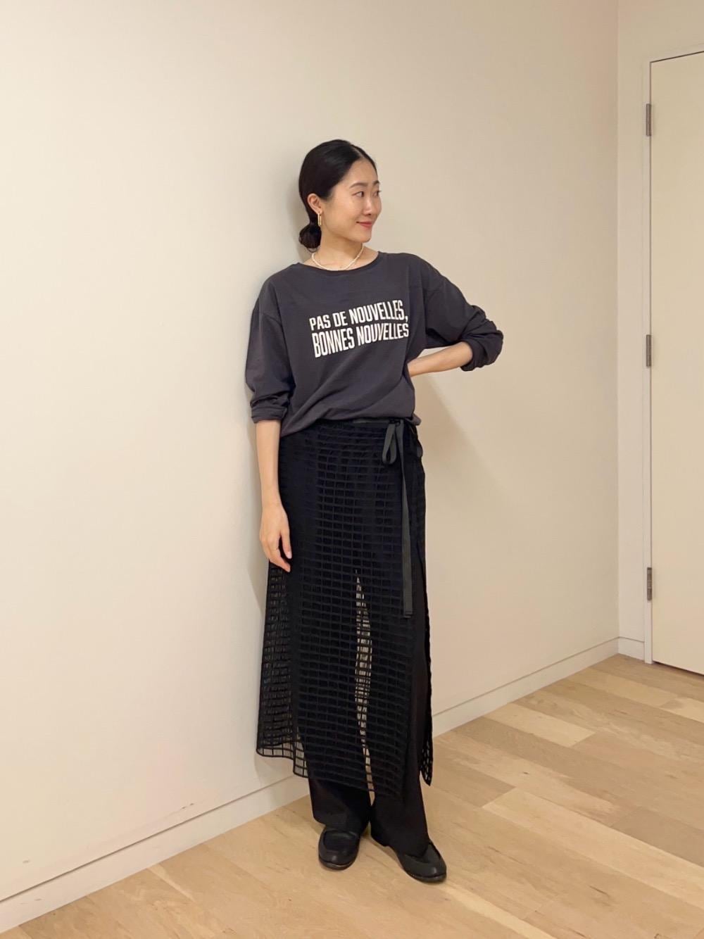 30代前半/159cm/骨格ナチュラル/普段サイズS-M/着用サイズ38 【BONNES VOUVELLESロゴプリントTシャツ】 サイズ感:ちょうど良い、ヒップが隠れる丈 素材感:さらっとなめらかな素材 着用感:柔らかくて着やすい。フロントの切り替えやロゴがアクセントになる。 【ダブルクロスストレートイージーパンツ】 サイズ感:ややゆったりめ、長めに穿きたい場合ちょうど良い丈 素材感:ドライタッチ 着用感:程よいゆとりでとても楽な履き心地。 【格子柄レースラップレイヤードスカート】 サイズ感:ウエストややゆるめ 素材感:なめらか 着用感:軽くて動きやすい