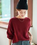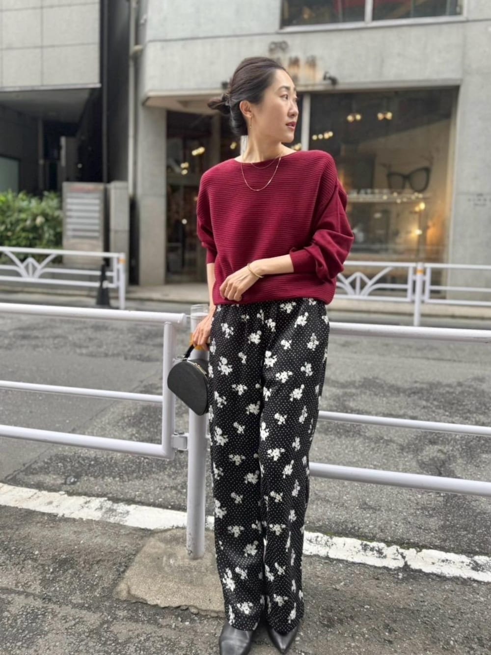 30代前半/159cm/骨格ナチュラル/普段サイズS-M/着用サイズ38/instagram:otm_____98 【横リブボートネックニット】 サイズ感:身幅はゆとりあり、丈はやや短め 素材感:もちっとしたニット素材。厚さは普通。 着用感:コンパクトにまとまるのでボトムを合わせやすい◎ 【ドット×フラワーサテンパンツ】 サイズ感:ウエストも丈もちょうど良い 素材感:やや薄手でさらっとしたサテン素材 着用感:すっきりしたシルエットでゆったりニットが合う◎