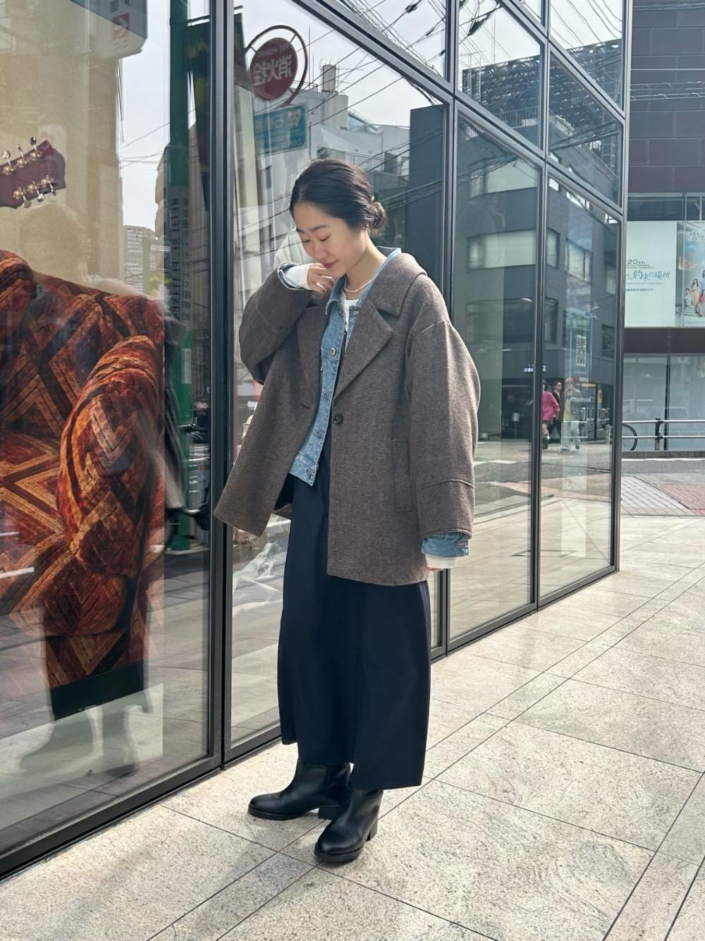 30代前半/159cm/骨格ナチュラル/普段サイズS-M/着用サイズ38/instagram:otm_____98 【ヘリンボーンミドルコート】 サイズ感:ゆったりめ、ヒップが隠れる丈 素材感:分厚すぎない、マットな触り心地 着用感:軽い。ゆとりがあるので重ね着しやすい◎ 【フィルムストライプキャミワンピース】 サイズ感:程良いゆとりあり、丈は調節可能 素材感:さらっと綺麗めな生地感、少し光沢あり 着用感:ストレスフリーで穿ける!着脱もしやすい。 【BONNES VOUVELLESロゴプリントTシャツ】 サイズ感:ちょうど良い、ヒップが隠れる丈 素材感:さらっとなめらかな素材 着用感:柔らかくて着やすい。フロントの切り替えやロゴがアクセントになる。