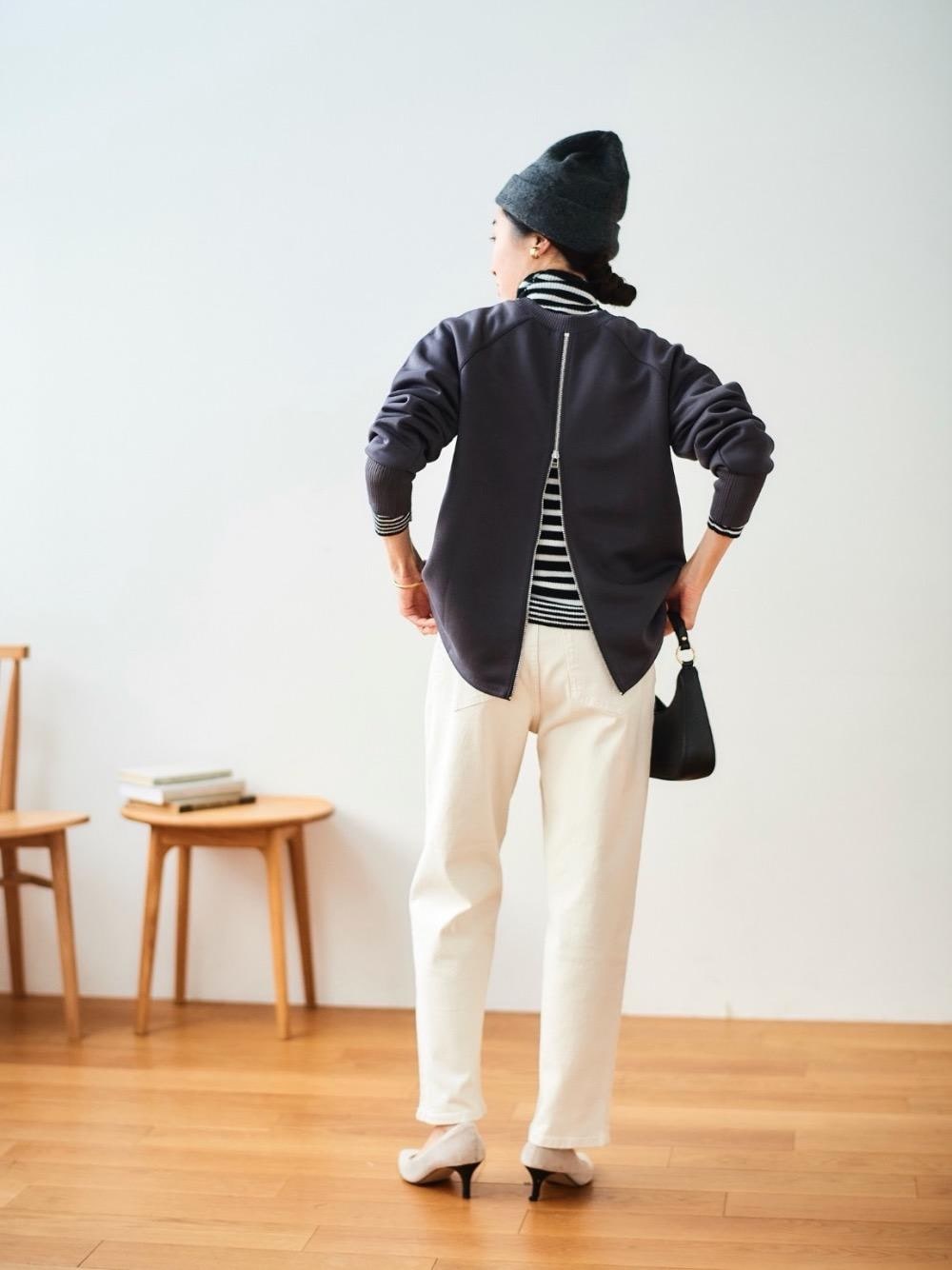 30代前半/159cm/骨格ナチュラル/普段サイズS-M/着用サイズ38/instagram:otm_____98 【バックジップボンディングトップス】 サイズ感:程良いゆとり、ヒップが隠れる丈 素材感:さらっとしている、薄くも厚くもない 着用感:裾が少しふわっとしていて可愛い。 【ソフトテーパードストレッチデニム】 サイズ感:ちょうど良い、足首が隠れる丈 素材感:やや薄手、伸びる 着用感:足を曲げ伸ばししやすく着やすい。