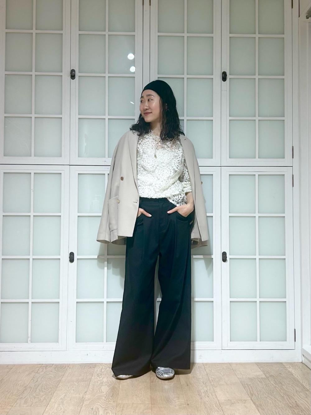 30代前半/159cm/骨格ナチュラル/普段サイズS-M/着用サイズ38/instagram:otm_____98 【CHOKLATE PARISモチーフレーストップス】 サイズ感:身幅にゆとりあり、腰にかかる丈 素材感:ややハリがあるが柔らかい。薄手で透け感あり。 着用感:程よくヘルシーな肌見せができて、抜けを出してくれる。 【メッシュダブルブレストジャケット】 サイズ感:ちょうど良い、ヒップにかかる丈 素材感:柔らかめ、透け感あり 着用感:硬さがなくストレスフリー。軽い。 【サスペンダー付タックワイドパンツ】 サイズ感:ウエスト大きめ、丈長め 素材感:やや薄手、柔らかすぎない生地感 着用感:ズルっとリラクシーな雰囲気で穿けるのが◎