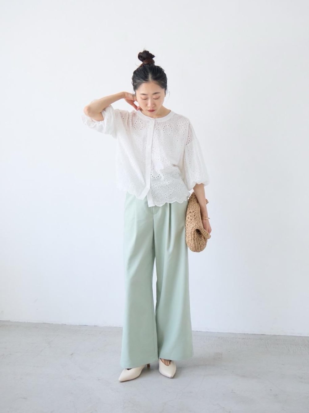 30代前半/159cm/骨格ナチュラル/普段サイズS-M/着用サイズ38/instagram:otm_____98 【カットワーク刺繍バルーンスリーブブラウス】 サイズ感:ちょうど良いゆとり、腰にかかる丈 素材感:透け感あり、薄手 着用感:袖のボリュームがポイントになり映えます。 【ウォッシャブルイージーパンツ】 サイズ感:ウエストはややゆとりあり、丈もやや長め 素材感:麻ほど薄くない、ドライタッチな素材 着用感:太さやシルエットがちょうど良い◎