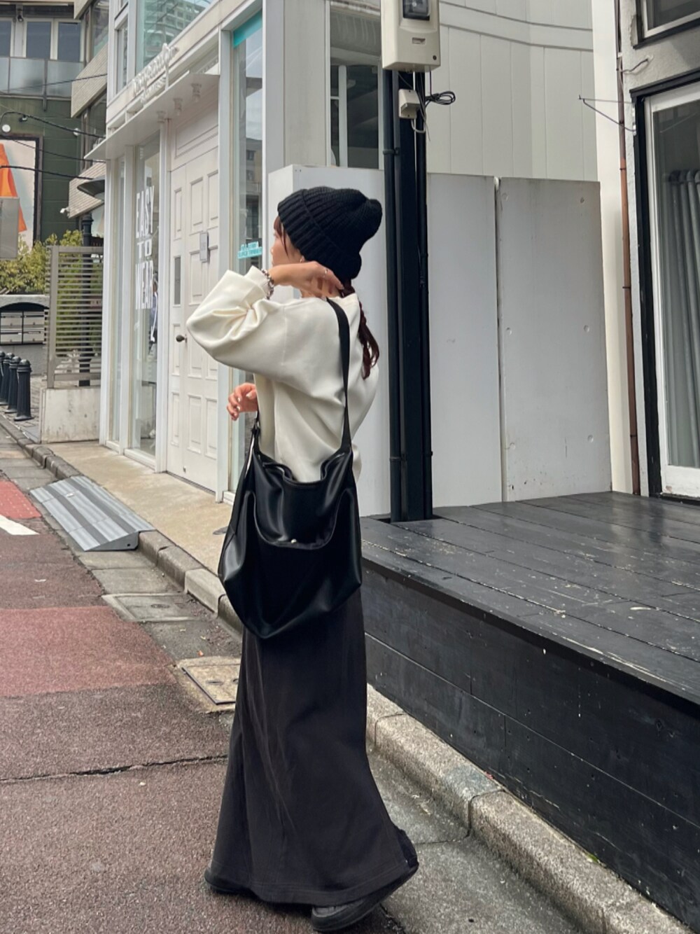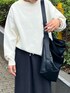シンプル合わせのコーディネート! トップスは生地感しっかりめで首元や袖口部分がよれにくいのも嬉しいポイントです! ゆるっと履けるスカートは、ごつめのスニーカーとの相性も抜群です◎