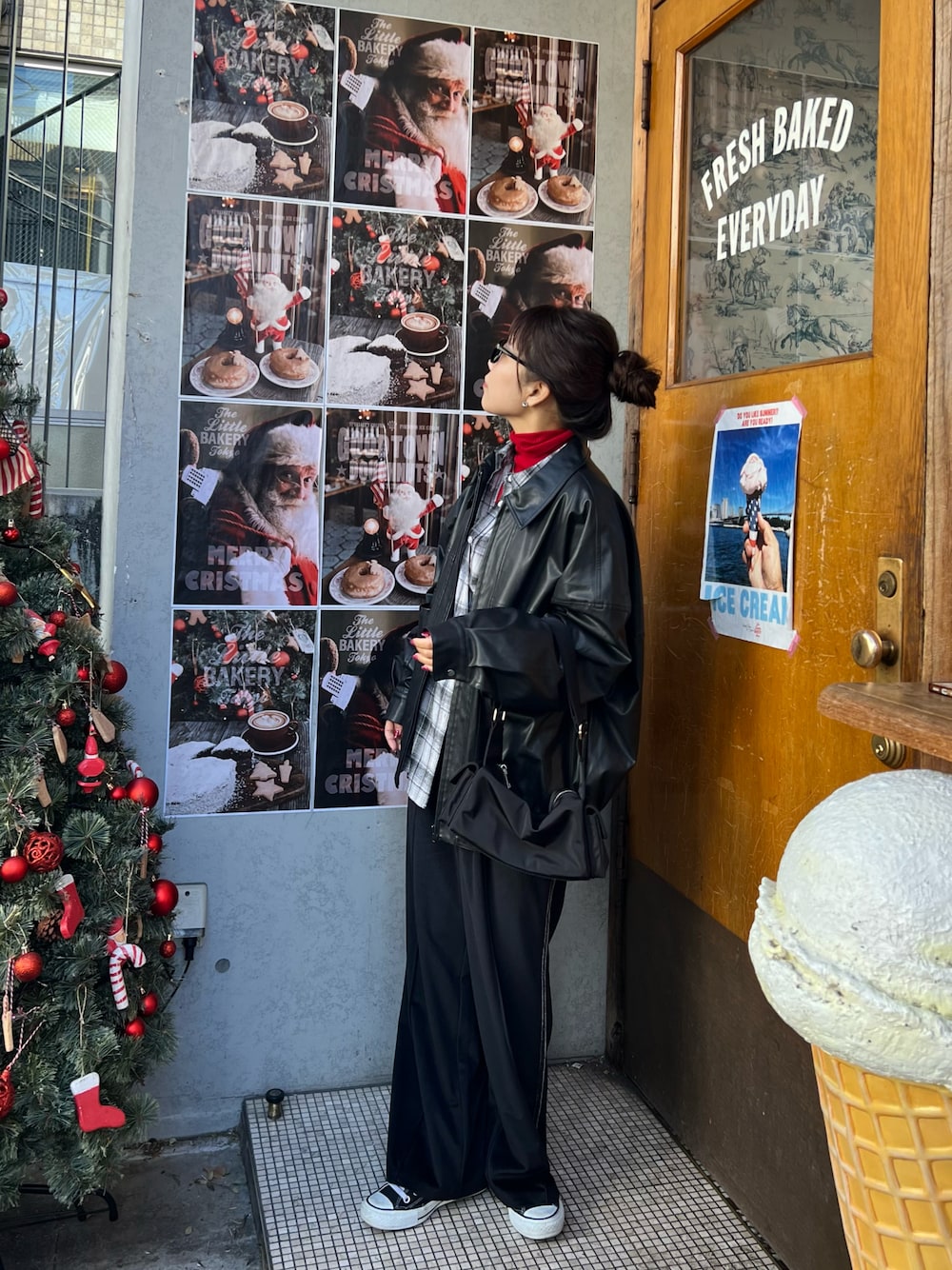シンプルでカジュアルなコーディネートに赤のタートルネックでクリスマス感をチラッと出したコーデ! 基本ブラックでまとめましたが色物や柄物を少し入れるとお洒落見えしておすすめです! ※レザージャケット Mサイズ その他全てフリーサイズ