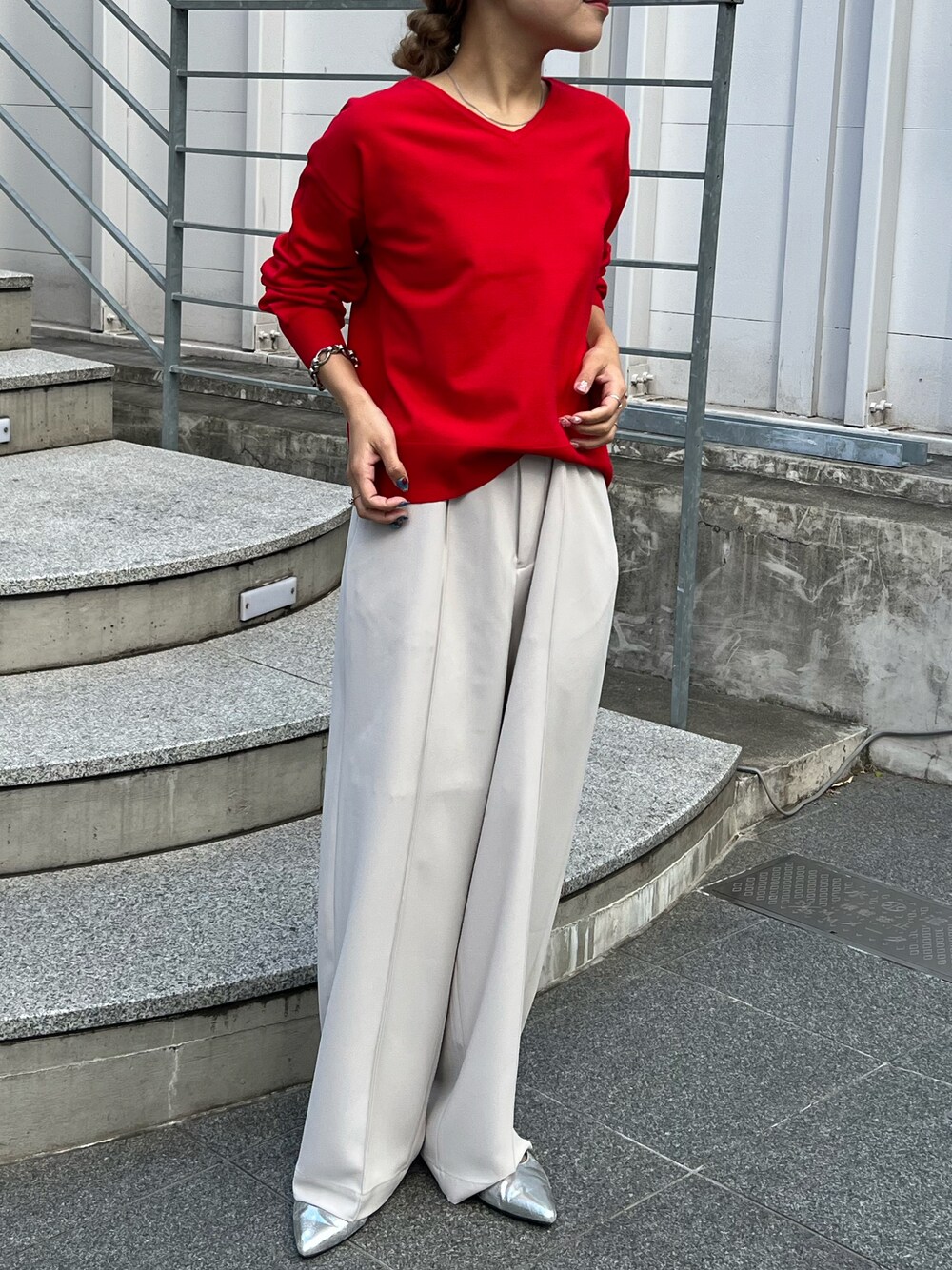 前後2WAYで使えるビスコースアイテム! 薄手のニット素材でロングシーズン使える一枚! 首元はVネックでも開きすぎないので、上品に使えるアイテムです! ※ パンツMサイズ、靴Mサイズ その他全てフリーサイズ着用