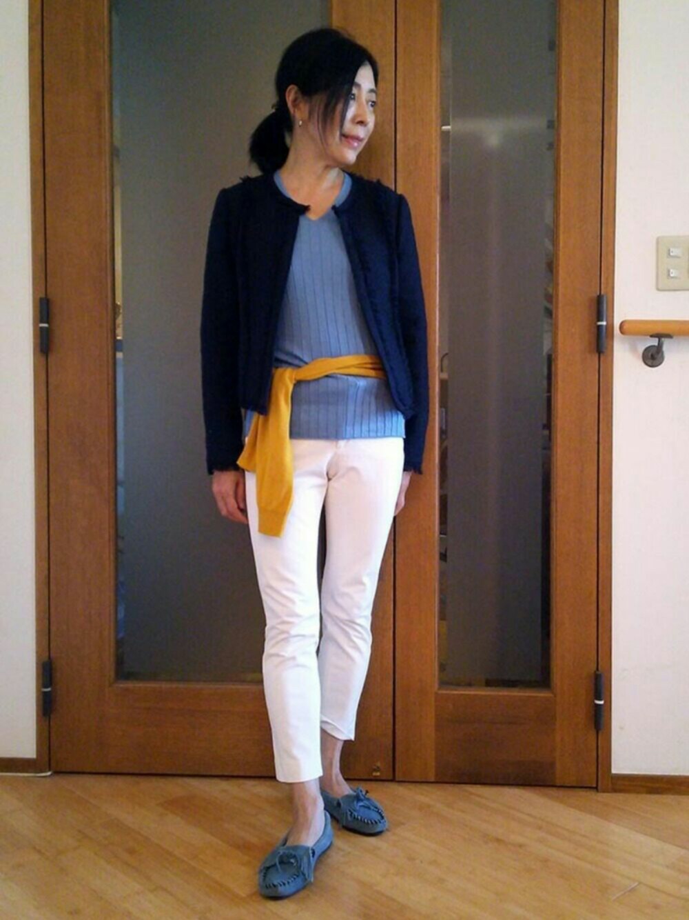 水色のリブニットをメインにして、ブルーのトーンでコーデしました。アクセントにマスタードイエローのカーディガンを腰に巻いています。