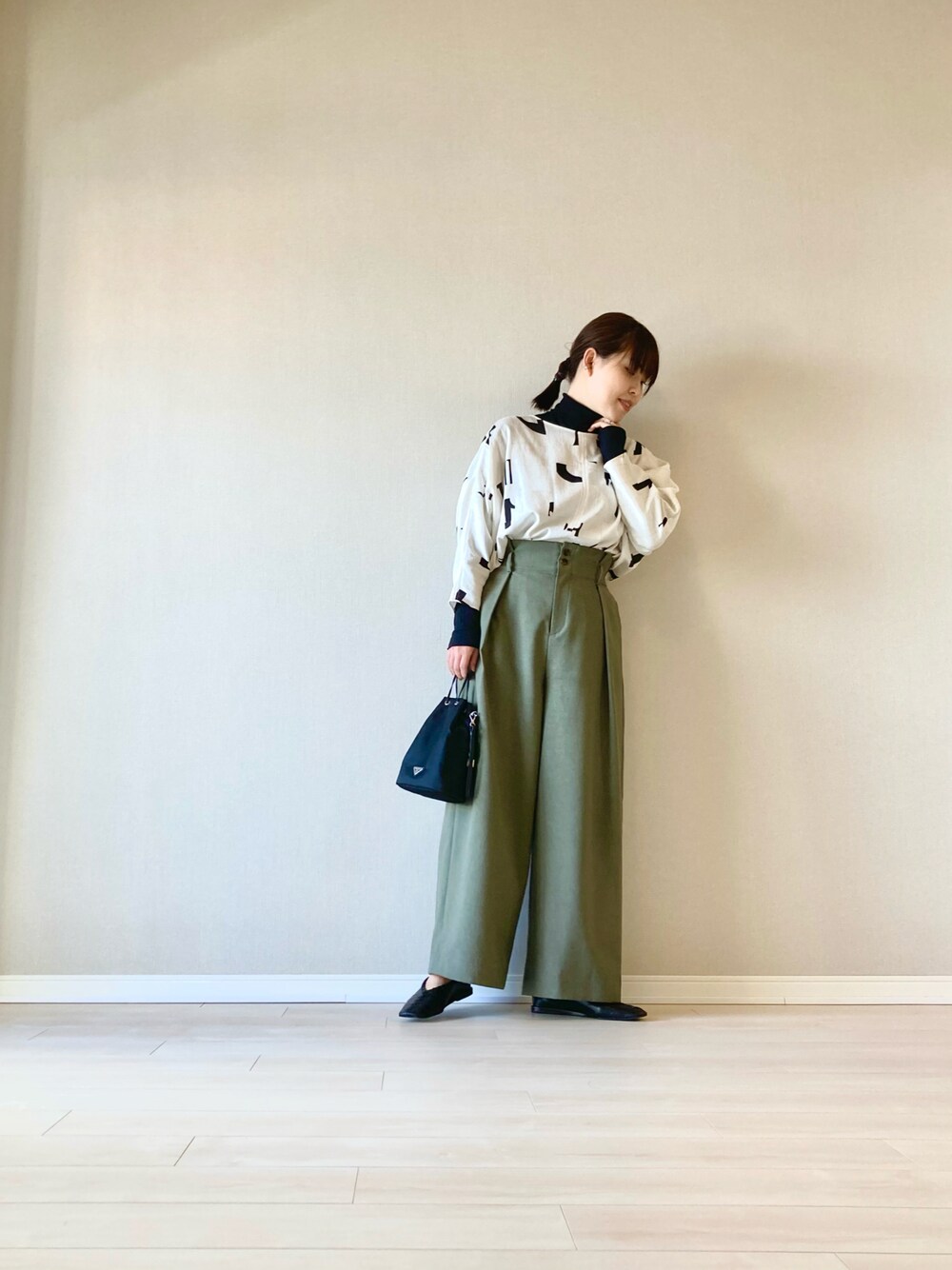 セットアップのパンツ着回しコーデです😊✨ ワイドパンツは履きやすいし、着回しも抜群で大好きです! 今回はDE PRESのトップスに薄いタートルをレイヤードして合わせてみました! 小物は黒で統一させています♪