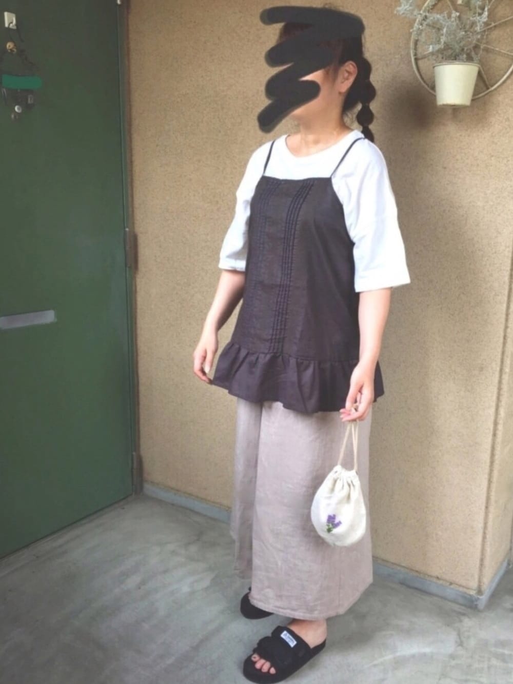 ゆるだぼコーデ❁.*・゚ ブラウン×ベージュコーデ ガーリーなキャミをラフでシンプルにスタイリング❤︎*。 白Tを長Tや長袖ブラウスにしたり、カーデを羽織ったら秋までコーデできそぅ〜♪ このワイドパンツは息子(つぐ吉)のん貸してもらったけど、そのうち母のクローゼットに入っていることでしょう(๑′ฅฅ‵๑)ヒヒヒ