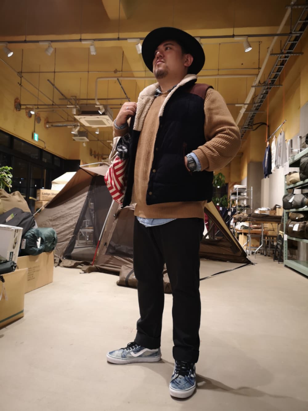 流行りの、ベージュコーデ。 デニムシャツをインナーに、シューズで色合わせ。 ダウンベストは、ネイビーのコーデュロイ素材。中は、秋冬らしいボア素材。 ベージュと、ネイビーの相性は抜群。 小物に、バックでの赤の遊び心を。