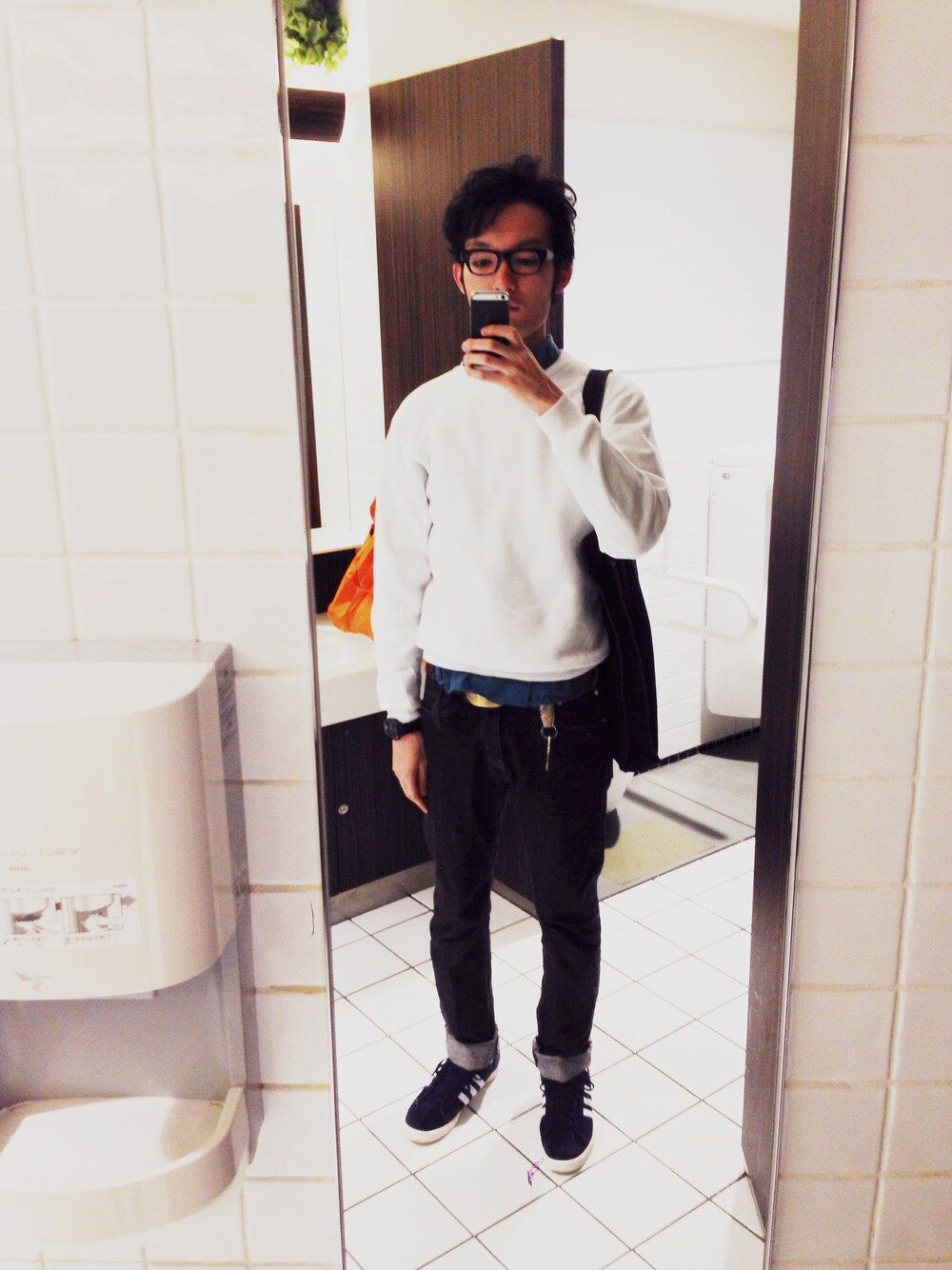 トップス : American Apparel シャツ : MUJI LABO パンツ : UNIVERSAL PRODUCTS メガネ : OLIVER PEOPLES スニーカー : アディダス 時計 : INDEPENDENT