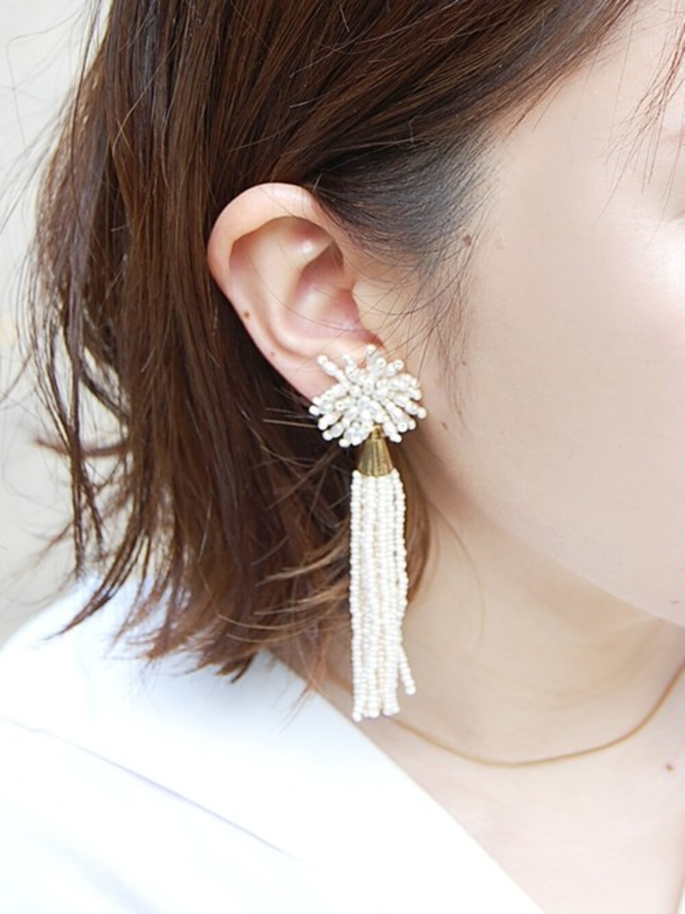 MAYGLOBE by Tribaluxe のメタルビーズフラワーモチーフとビーズタッセルのピアスです。 メタルビーズのフラワーモチーフがコーデのアクセントにぴったり◎ ゆらゆらと揺れるビーズタッセルはボリューム感があり華やかな印象に。 人と差をつけたいときにぴったりです。オケージョンにもおすすめ◎