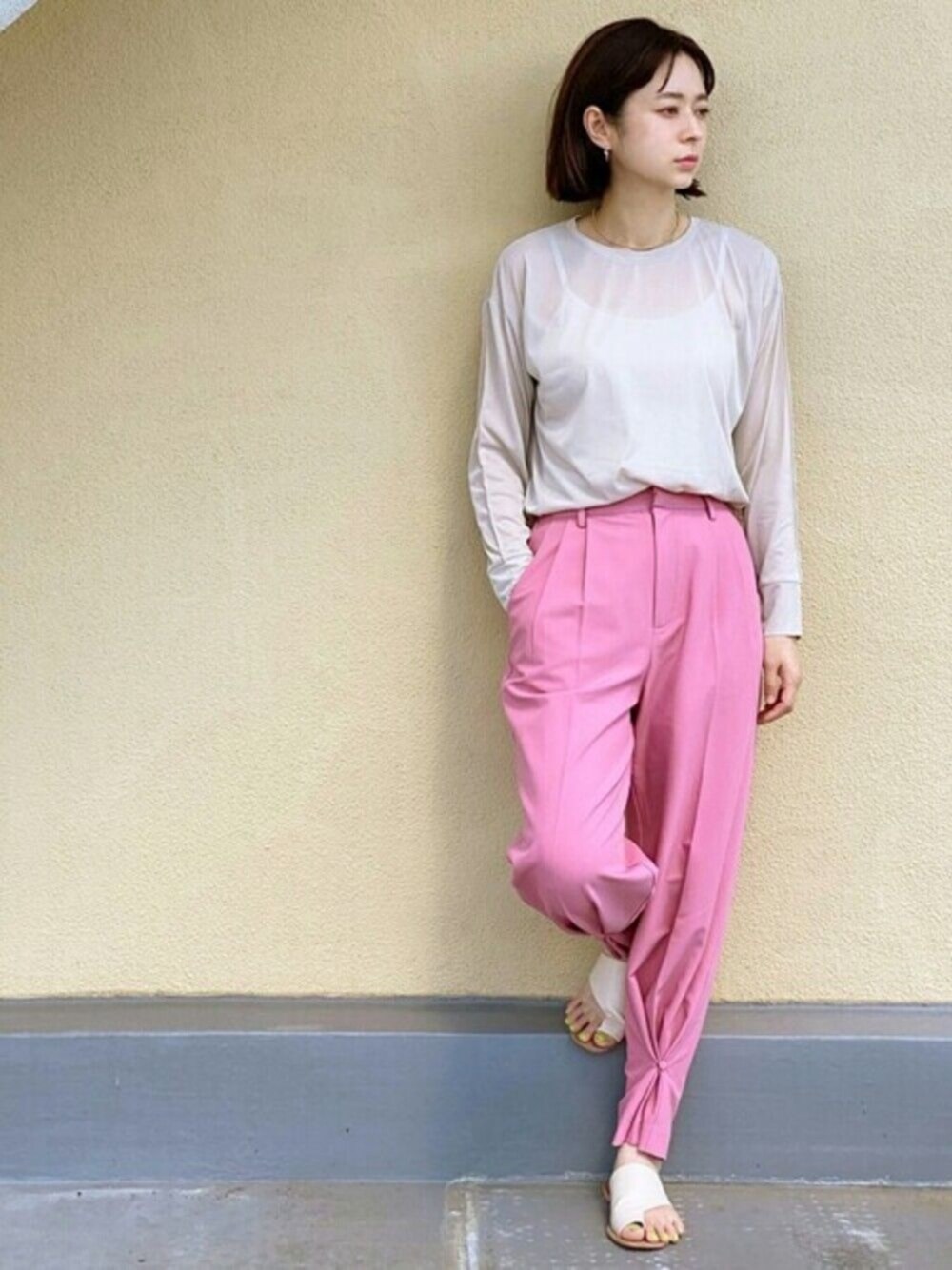 シアーロングスリーブとカラーパンツを合わせた大人カジュアルスタイル☻ さりげない透け感で、カジュアルなスタイルも艶感のある着こなしに。