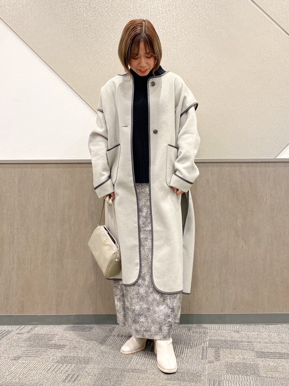 oukaのノーカラージャケット「リバーパイピングコート」を使ったコーディネート