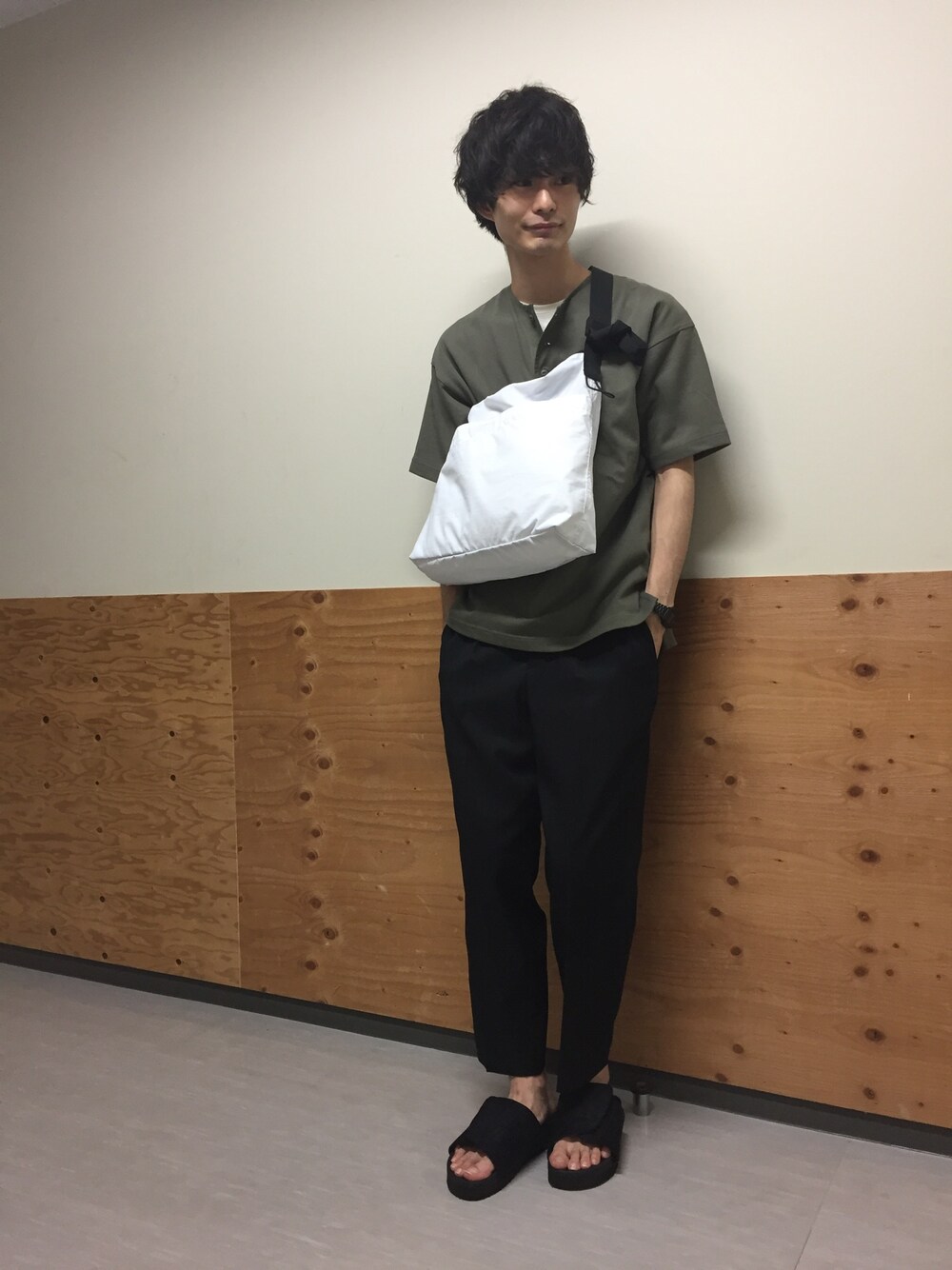 色味を抑えた大人カジュアル ヘンリーネックで抜け感を出し 黒と白をバランス良く合わせることで清潔感を出すのがポイント٩( 'ω' )و