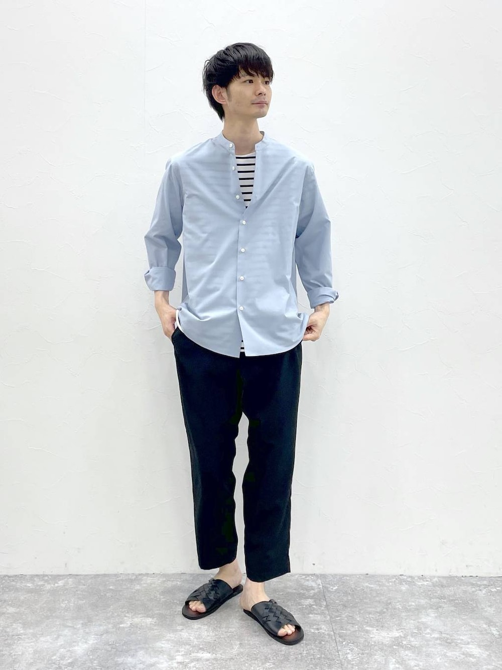 ⭐各アイテムのおすすめポイント  ̄ ̄ ̄ ̄ ̄ ̄ ̄ ̄ ̄ ̄ ̄ ̄ ̄ ̄ ̄ ̄ ̄ 【トップス】 薄手でサラッとしたバンドカラーシャツ。 透け感はありますが爽やかに着こなせます。 春先から着方によっては秋口にもおすすめ。 【Tシャツ】 ゆったり目サイズのボーダーTシャツ。 コットンの柔らかい肌触りです。 細身の方はMサイズでもおすすめ。 【ボトムス】 丈感は少し短めです。 太ももまわりはゆったり目。 ウエストはイージー仕様で、 とにかく穿き心地の軽いパンツです。