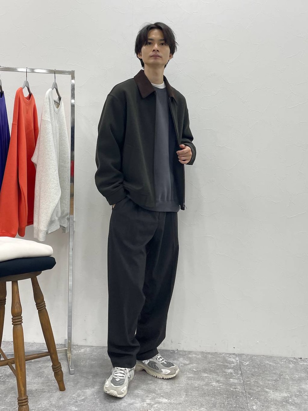 短丈で今っぽいブルゾンスタイル。 スウェットをインナーにして、 デイリー使いしやすいながら スラックス合わせのちょいキレイめに。