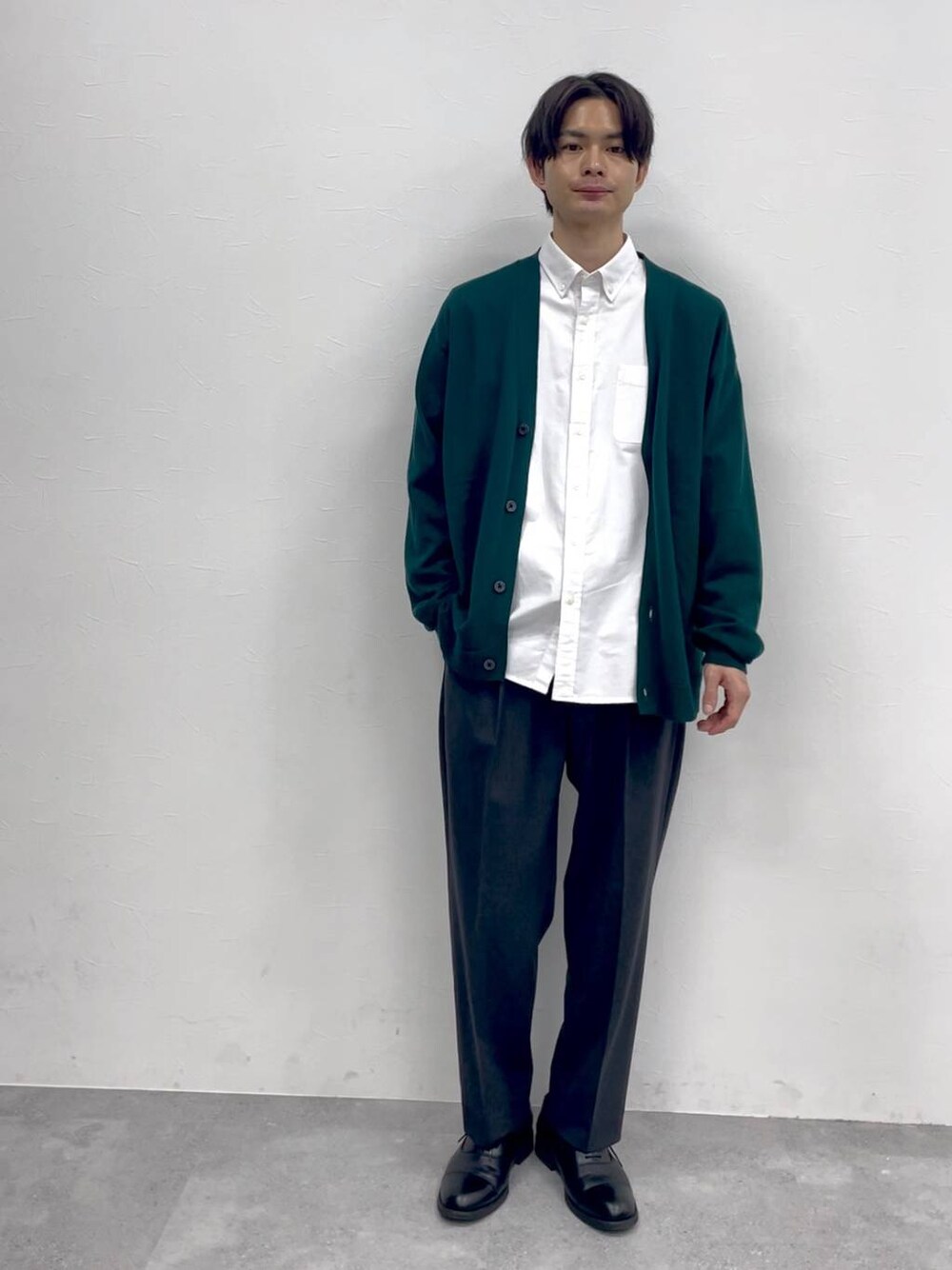 一足早く春コーデ紹介! 鮮やかなグリーンカーディガンを アクセントにしたキレイ目スタイル カーディガンとパンツは程よく ゆったり目でラフに着こなせます。 デザインはミニマルで上品なので 大人でも着こなしやすいスタイルです!