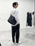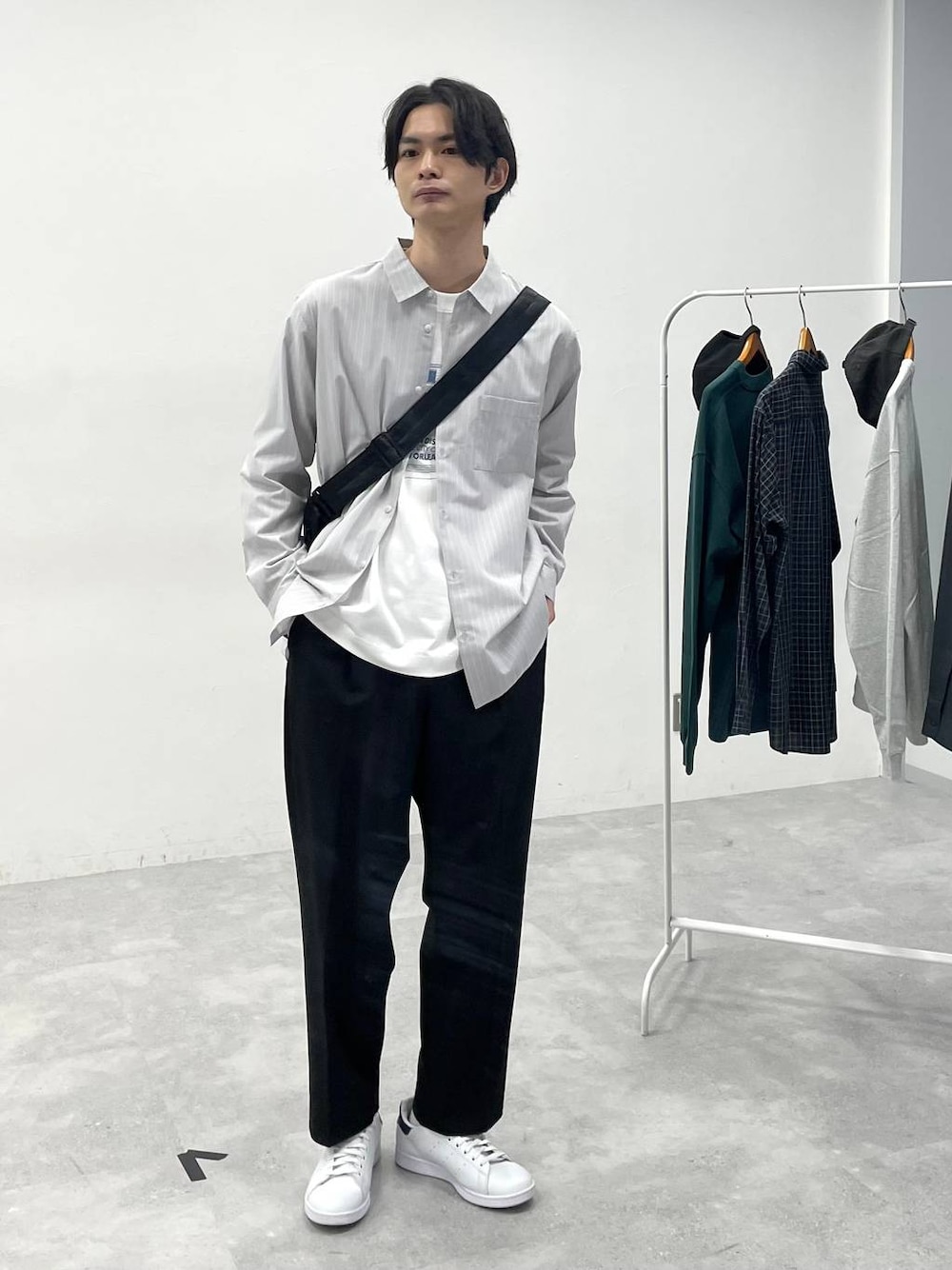 春のシャツスタイル 爽やかなストライプ柄に黒のワイドパンツを 合わせてキレイ見えのスタイルにまとめています。 ストライプ柄はそこまで主張が強くないので プリントTとも合わせられる一枚!