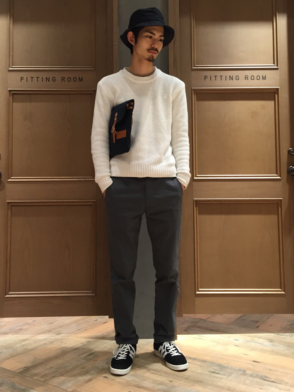 一足早い春先コーディネート 白セーターのきれいさとカーキチノの武骨さでギャップを出すのがオススメです。 シンプルなデザインなので小物で遊びを入れてこなれ感をUPしてみてください! 今回はローテクスニーカーを合わせていますが流行りのハイテクスニーカーで個性を出すのもいいですね!! セーターのカノコとは鹿の子の背中のまだら模様が由来だとか… 丈夫で毛玉も出来にくいので着まわしやすいのも特徴です!