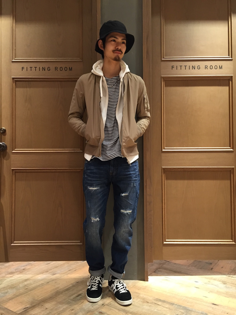 パーカーコーディネート パーカーと相性バツグンのMA-1にダメージデニムで少し武骨に シルエットは細身を選びクリーンな印象で