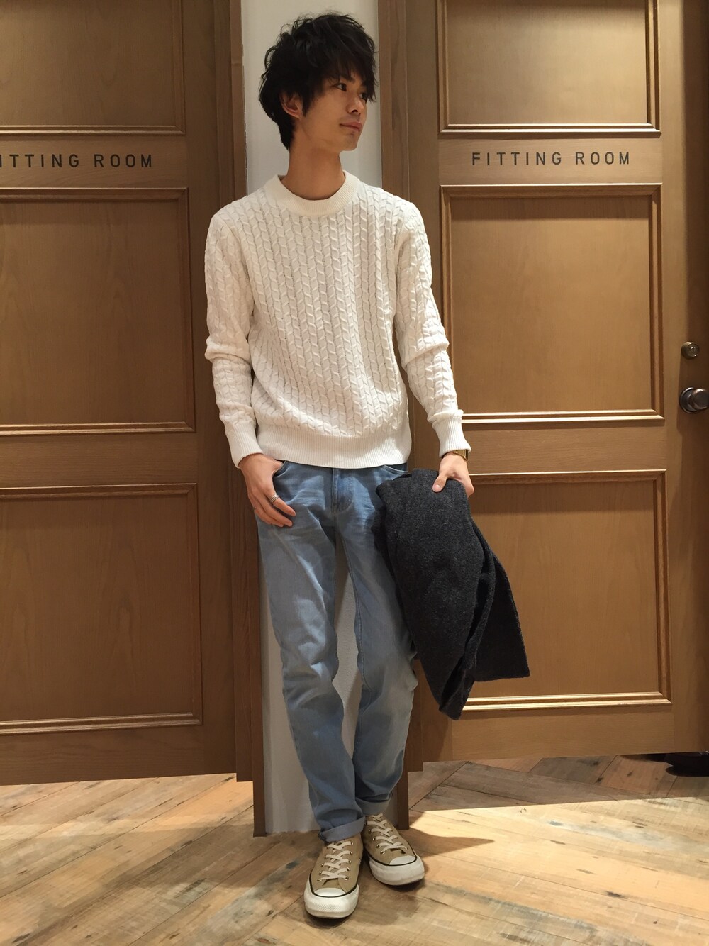 2015年もあと少し! 1年があっという間に過ぎてしまいますね! やり残したことが無いように日々を大切に過ごしたいですm(_ _)m 今回はライトブルーのデニムを使ったコーディネートです! 入荷した瞬間 「こういう色を待ってた!!!」 と歓喜しました\(^o^)/ ホワイト、トレンドのカーキ、ネイビー、グレー...etc 本当に様々な色と相性が良いライトブルー 合わせ方によってキレイ目にもカジュアルにも使える万能アイテムです! ストレッチも入っており履きやすさも抜群! 厚みも程良く一年中履くことも! ぜひ落ち着きがちな冬のコーディネートに爽やかさをプラスしてみて下さい(^ν^)