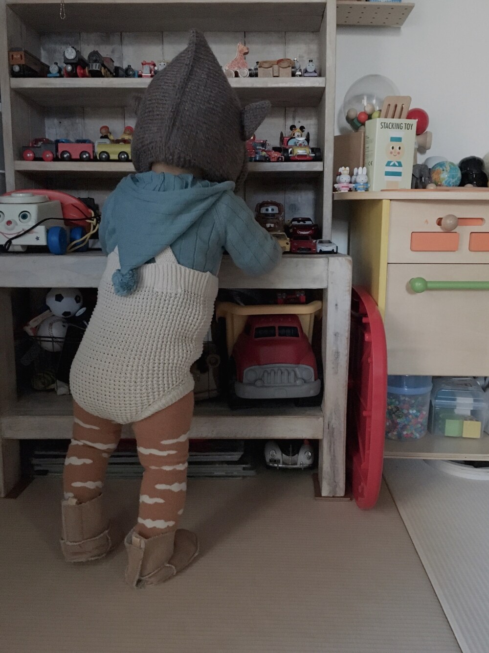 ブラウン系のニットキャップ/ビーニーを着用したキッズの秋コーディネートの1枚目の写真