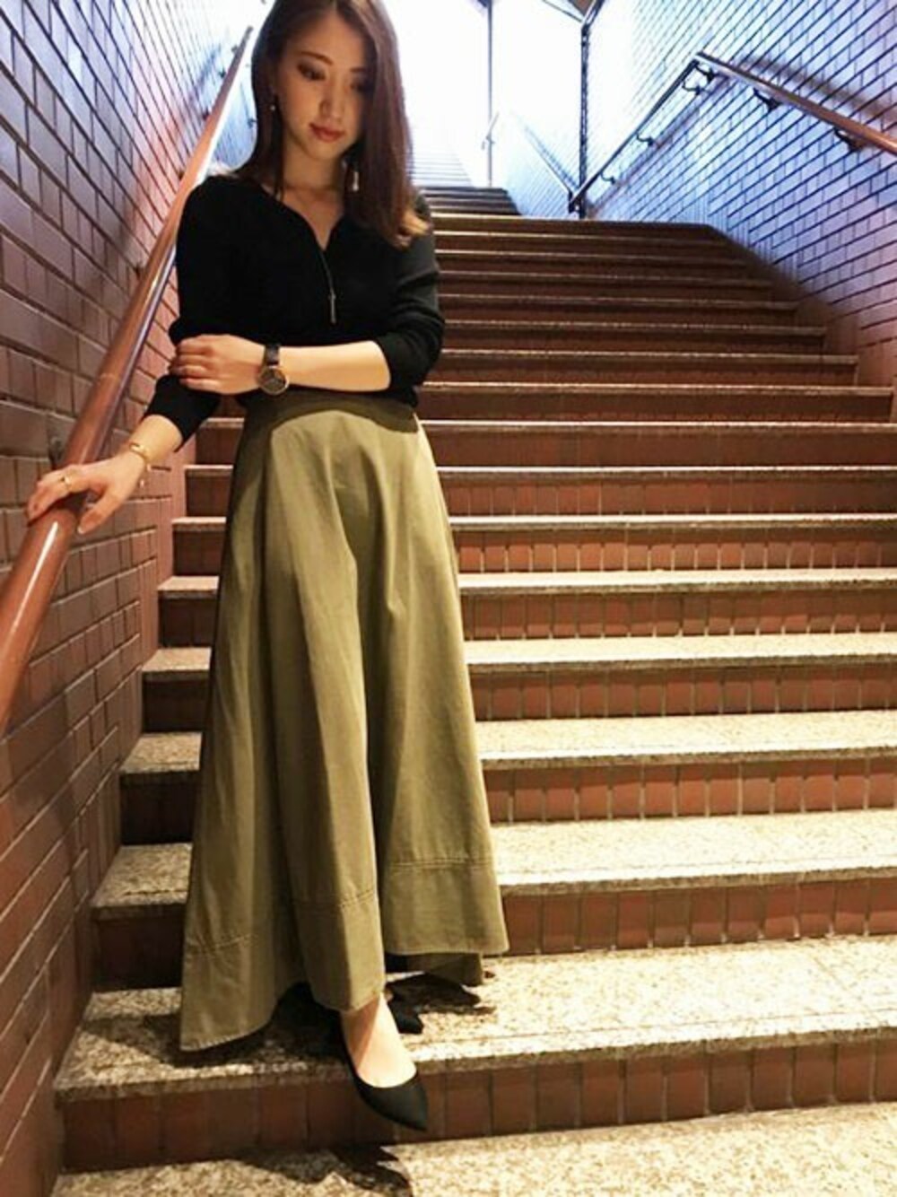 スッキリとしたシルエットのニットをボリューミーなフレアスカートと合わせました。 ニットは♡の形の襟ぐりがポイント。 タイト×フレアの組み合わせで、全体的にスッキリとした印象に。