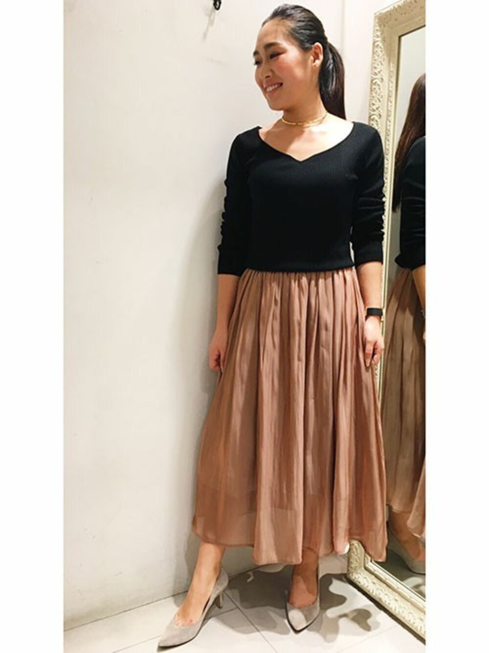 ゆるりとあいた♡型のネックがポイントのニット。 サテン地の軽やかなギャザースカートと合わせてフェミニンな雰囲気。 軽やかな素材感のスカートなので オールシーズンお使いいただけます!! 女子会やお出かけにオススメです♪