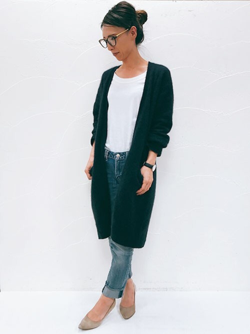 ふわふわモコモコのラクーンカーディガンを取り入れたカジュアルコーデ♪ インナーはカットソーとデニムパンツでカジュアルに モコモコした毛足がかわいいロングカーデをさらっと羽織り スッキリとした印象に仕上げました♪